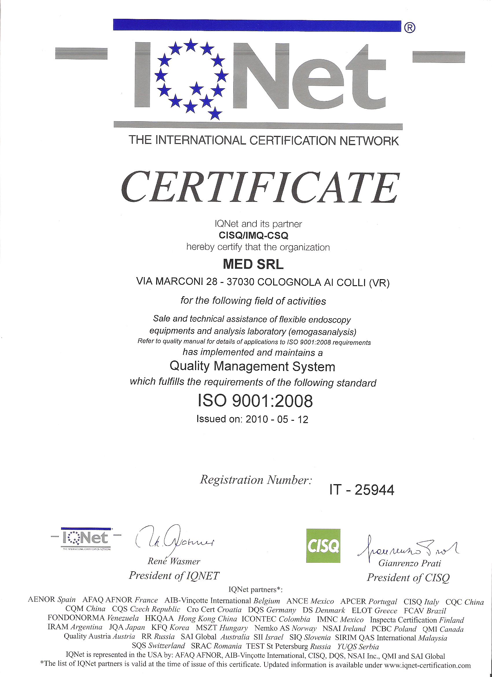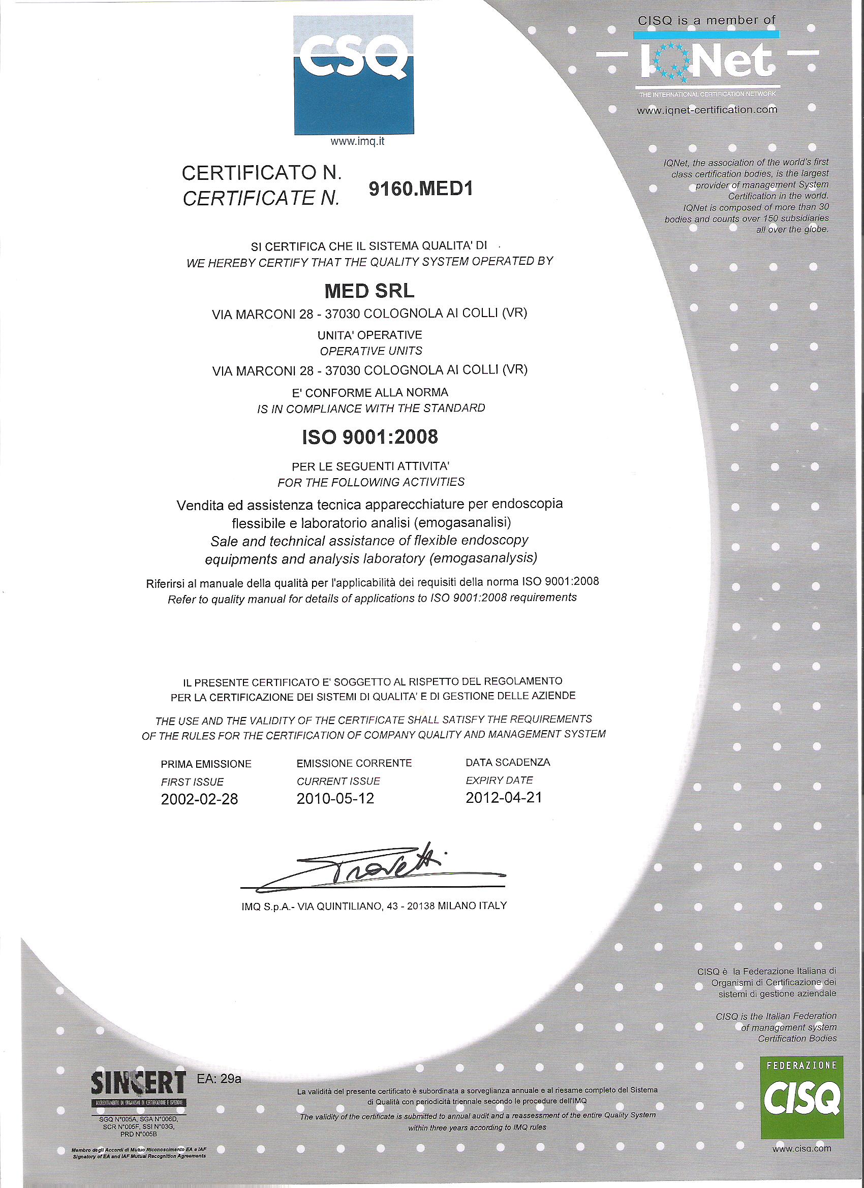 In data 12/05/2010, MED S.r.l. ha ottenuto la certificazione ISO 9001:2008